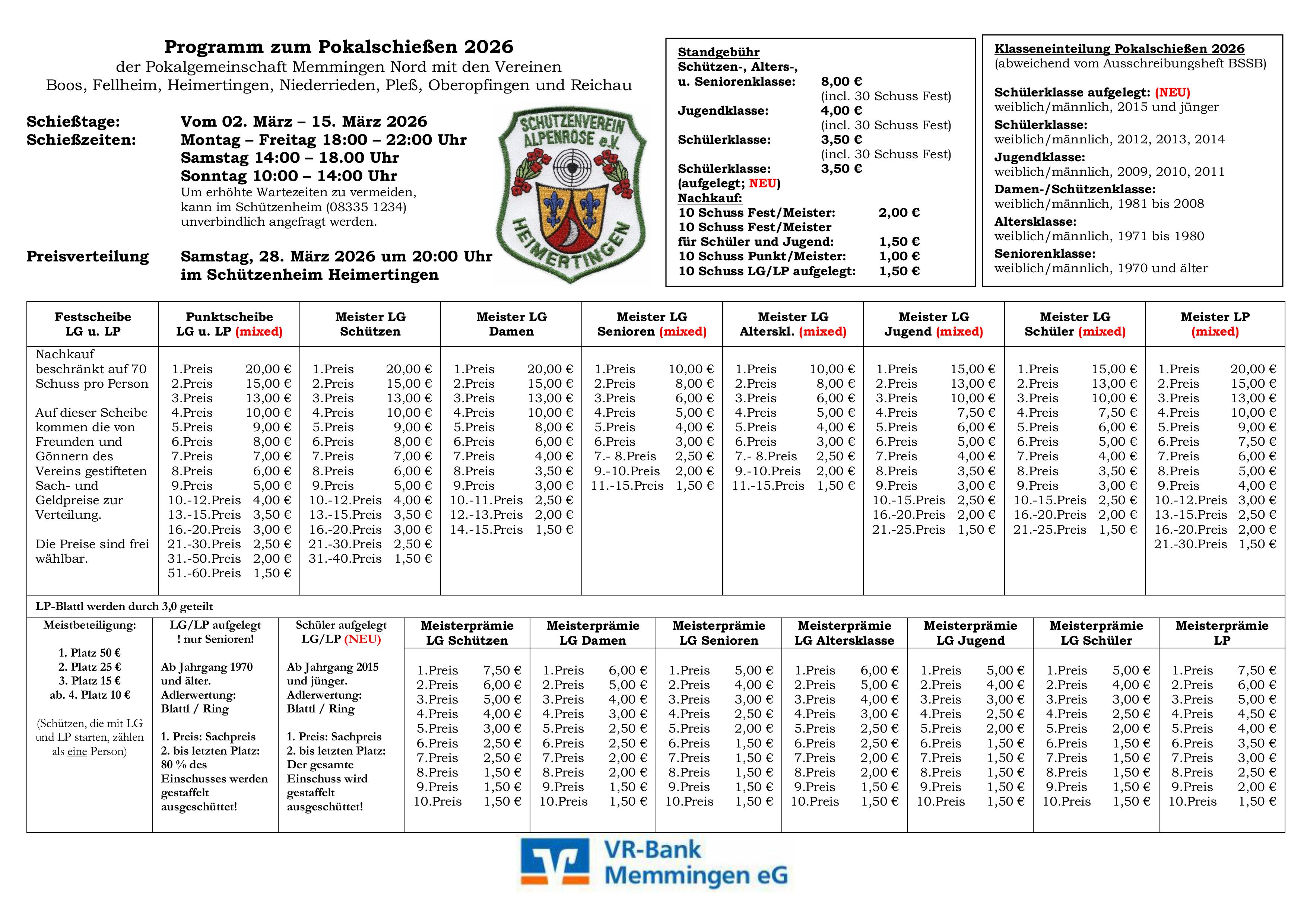 Wir sind Mitglied im Bayerischen Sportschützenbund und im Gau Memmingen, bzw. dem Bezirk Schwaben überörtlich organisiert. Unsere Vereinsräume sind seit 1967 im Kellergeschoss der Turnhalle in der Ortsmitte zu finden. Bei uns können die Waffenarten Luftgewehr, Luftpistole, CO2 Waffen und Zimmerstutzen geschossen werden. Für das Schießtraining steht eine Reihe von unterschiedlichen Vereinswaffen zur Auswahl. Eigene Waffen können jederzeit ebenfalls genutzt werden, sofern sie den Bestimmungen entsprechen und die notwendigen Waffenbesitzkarten vorhanden sind. Für die Unterweisung und Beaufsichtigung unserer Jung- und Altschützen steht ein kompetentes Team mit den entsprechenden Übungsleiter- und C-Trainerlizenzen sowie ausgebildetes Standaufsichtspersonal bereit. Ab einem Alter von ca. 8 Jahren kann man bei uns mit dem Lichtgewehr oder Blasrohr aktiv werden. Ab zwölf Jahren dürfen unsere Jungschützen dann mit Druckluftwaffen und Projektil das Sportschießen trainieren.